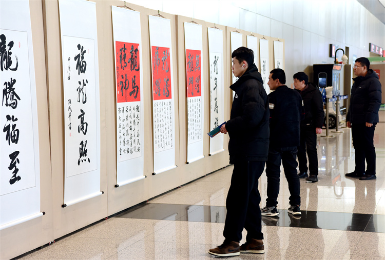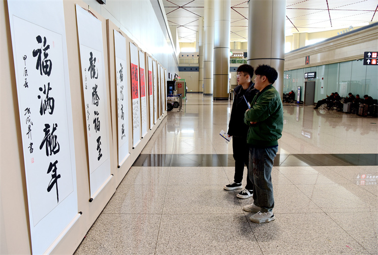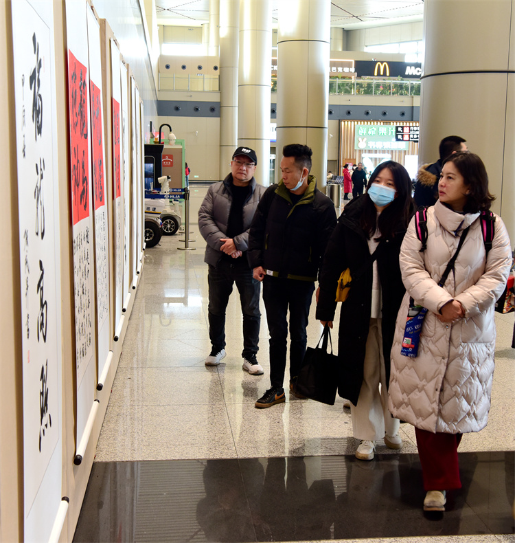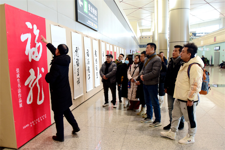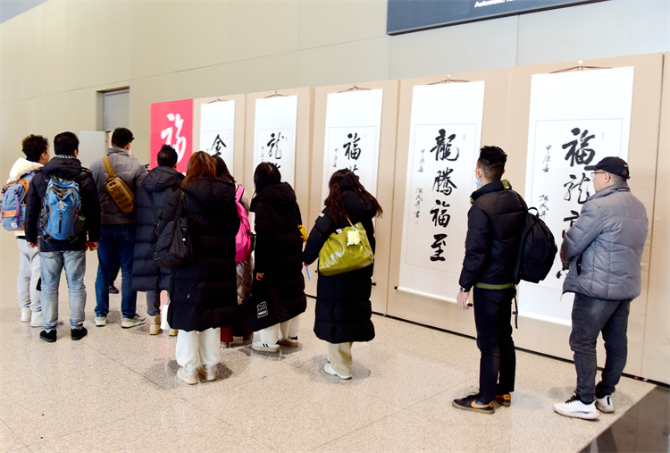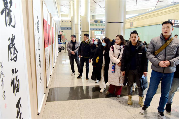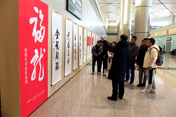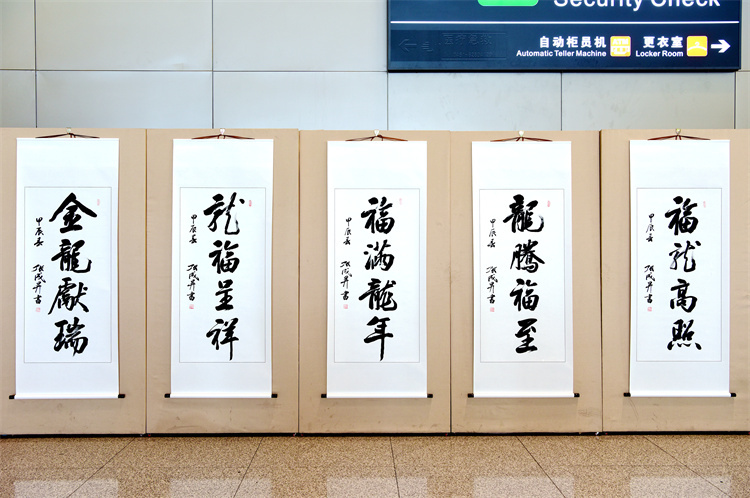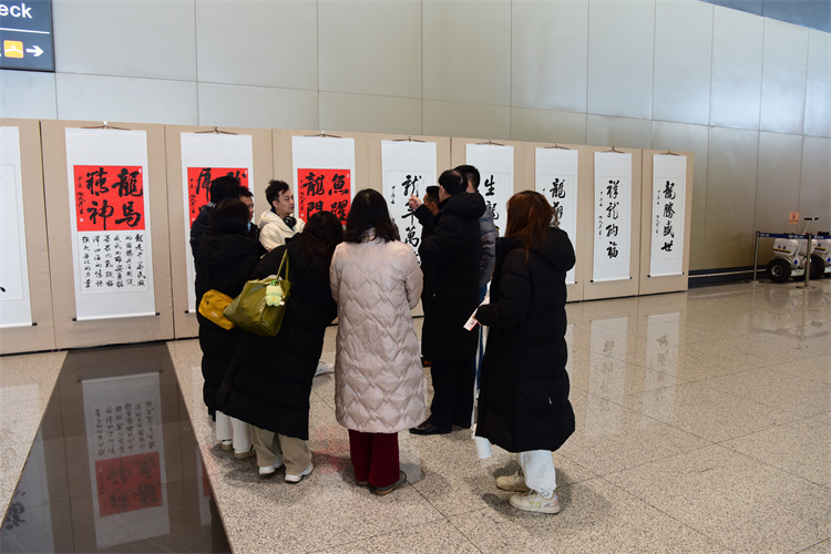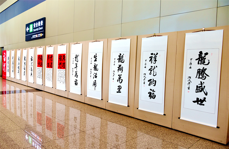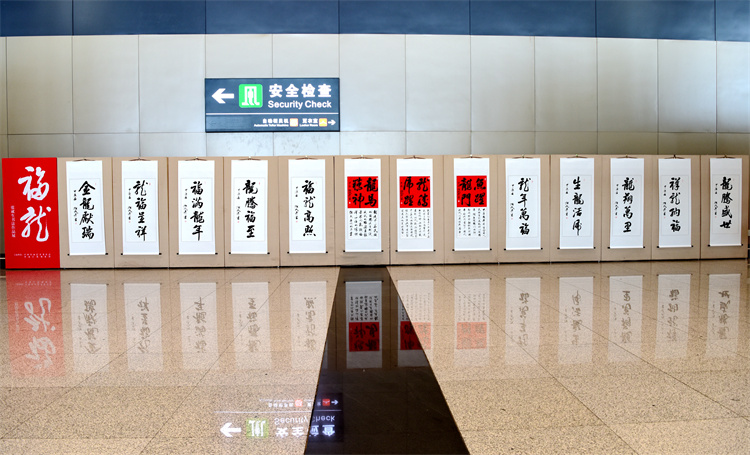 展出现场,墨香扑鼻,卷轴舒展,作品布置错落有致、恢宏大气,机场过往旅客络绎不绝,不少旅客驻足观摩,有的细细品读,有的研习书法,有的手机拍照,还有的现场留影。“龙腾华夏国兴旺,福降神州民寿康。作为龙的传人,龙年书龙,为‘福龙’书法作品展作者付诸的实际行动点赞,为这种喜闻乐见的中国传统文化形式点赞”,一位过往旅客和书法爱好者在观摩展览时赞许说。
