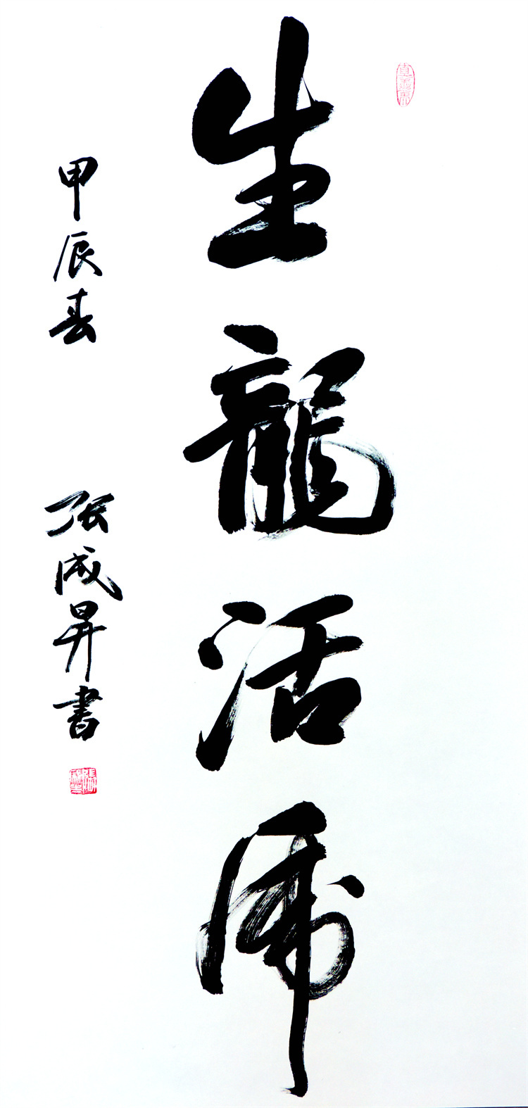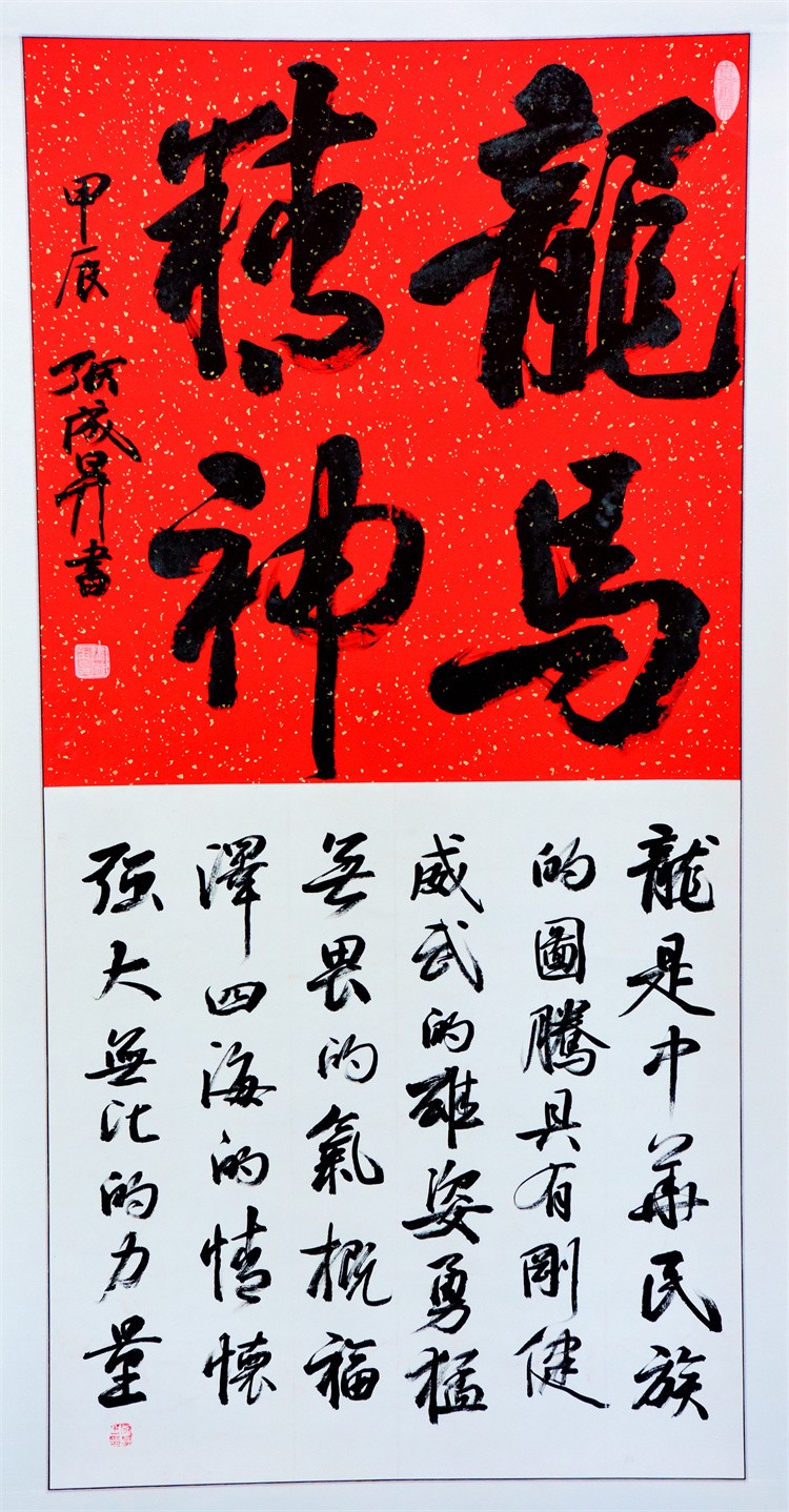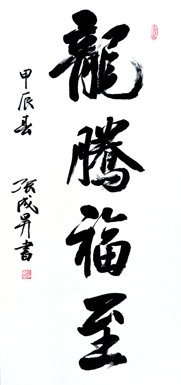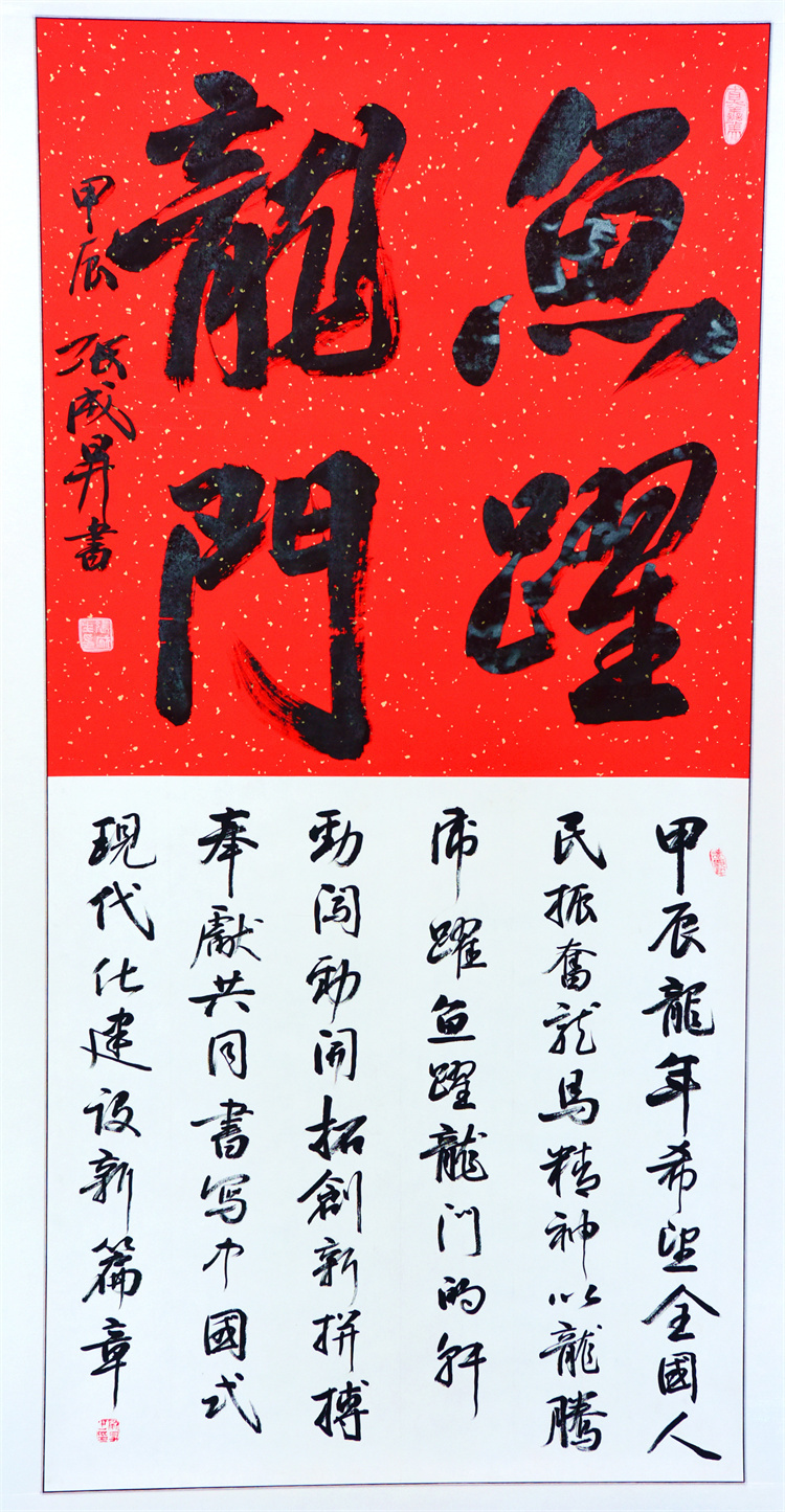 龙行龘龘,龙年书龙。龙在中国有着特殊的含义,龙是中国的象征,是中华文化的象征。甲辰龙年,作者张成生以“福龙”为主题,精心创作并展出“龙马精神、龙腾虎跃、鱼跃龙门”和“福龙高照、生龙活虎、龙腾盛世”等大、中、小幅书法作品近20幅,其创意新颖独特,主题鲜明,寓意深刻,字体多变,气象万千,体现了作者的笔墨情怀和书家修为。