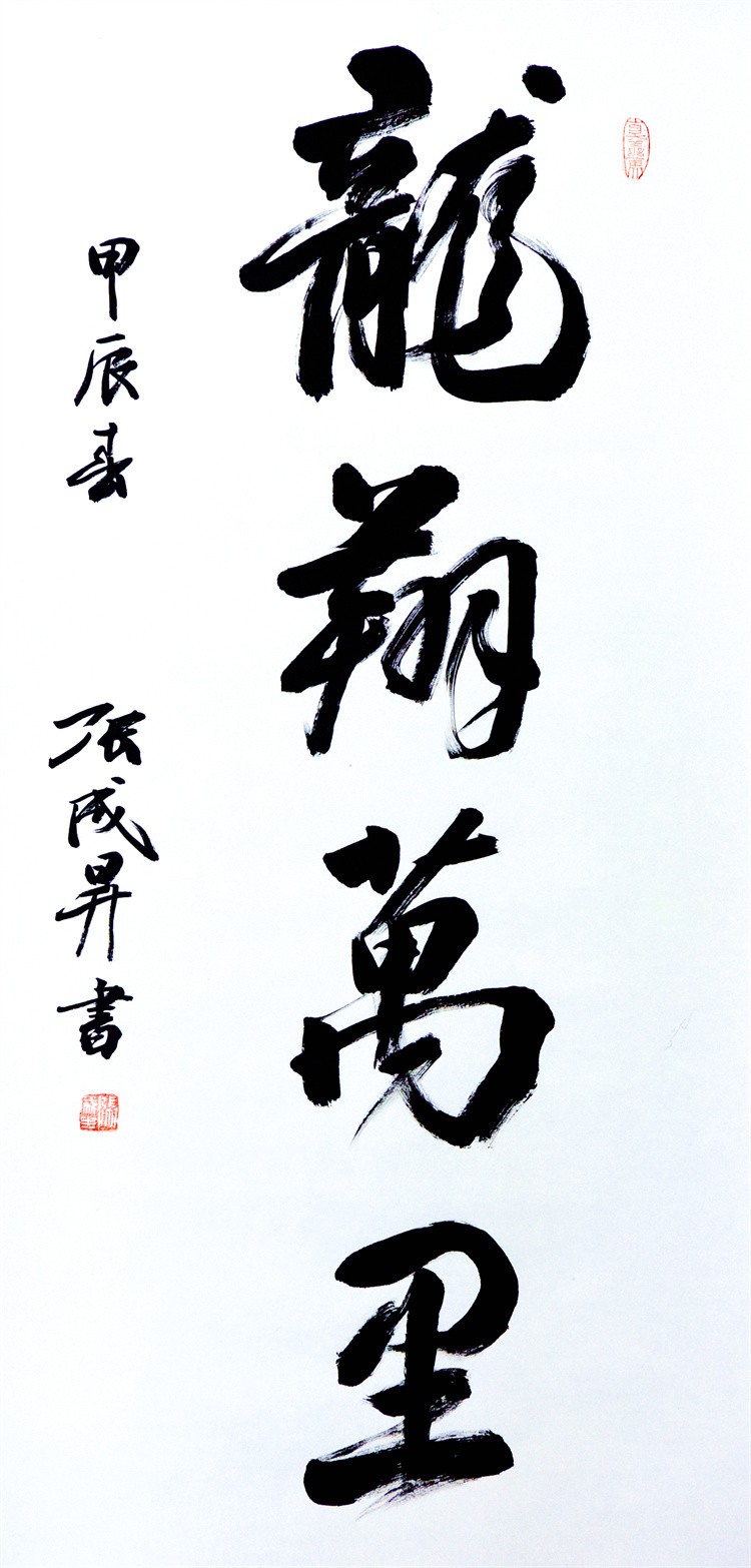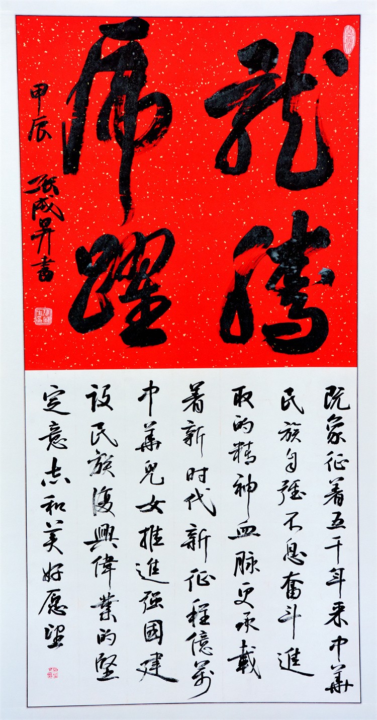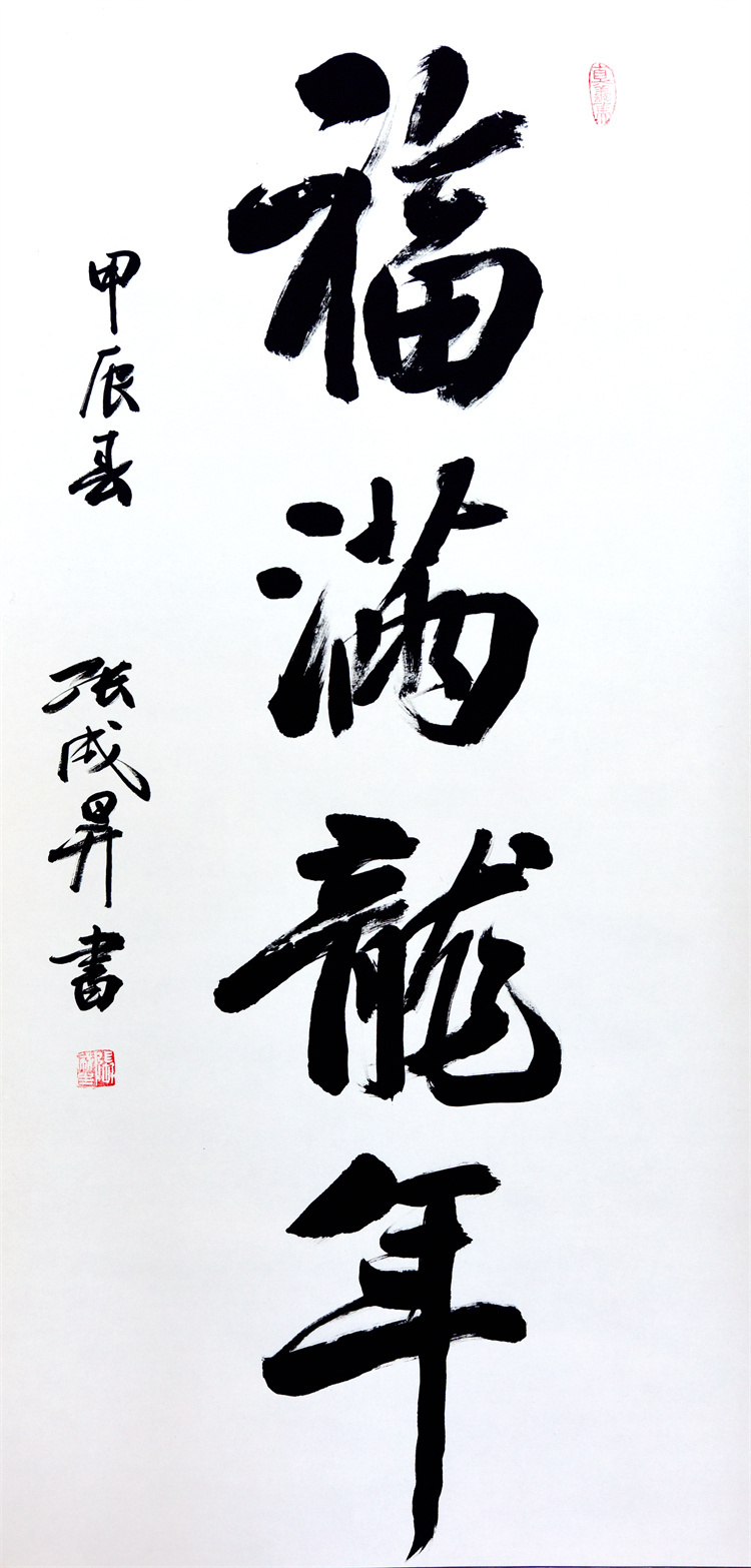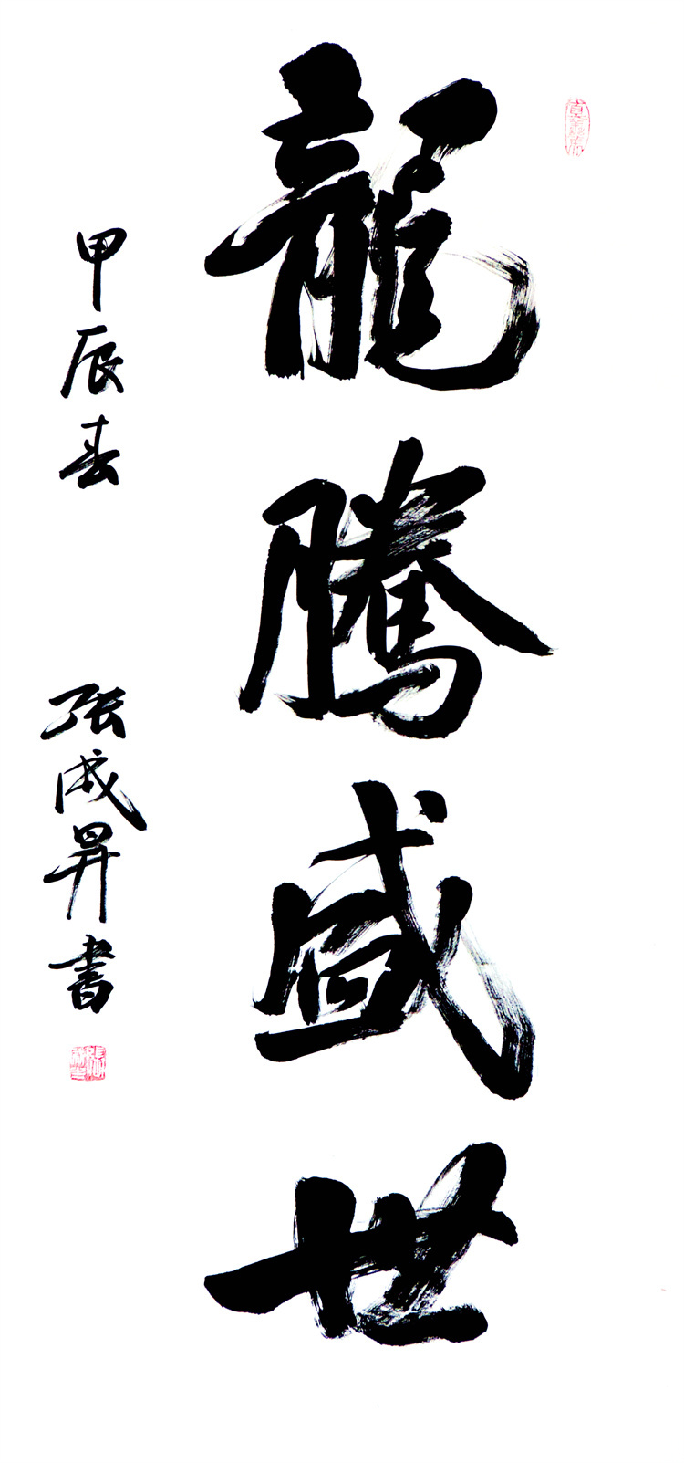 龙行龘龘,龙年书龙。龙在中国有着特殊的含义,龙是中国的象征,是中华文化的象征。甲辰龙年,作者张成生以“福龙”为主题,精心创作并展出“龙马精神、龙腾虎跃、鱼跃龙门”和“福龙高照、生龙活虎、龙腾盛世”等大、中、小幅书法作品近20幅,其创意新颖独特,主题鲜明,寓意深刻,字体多变,气象万千,体现了作者的笔墨情怀和书家修为。