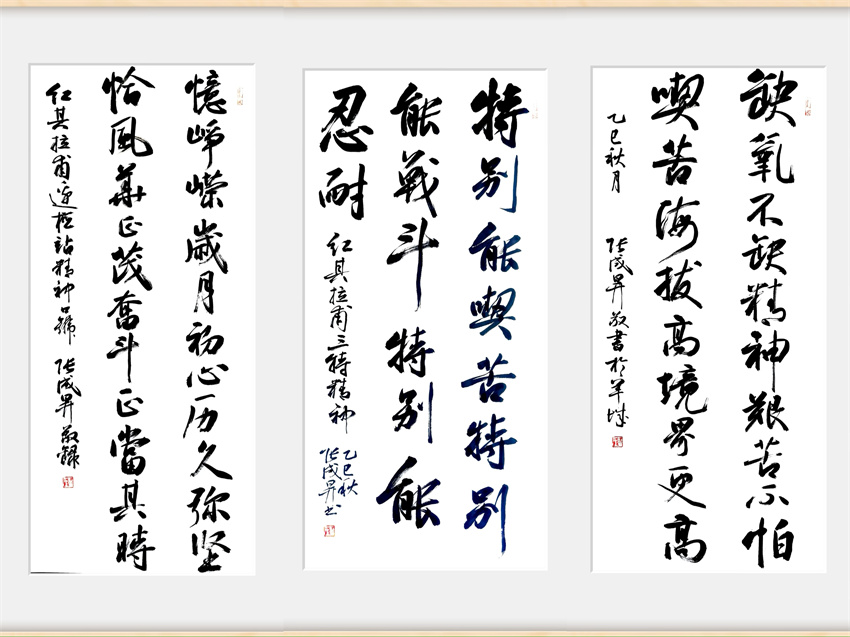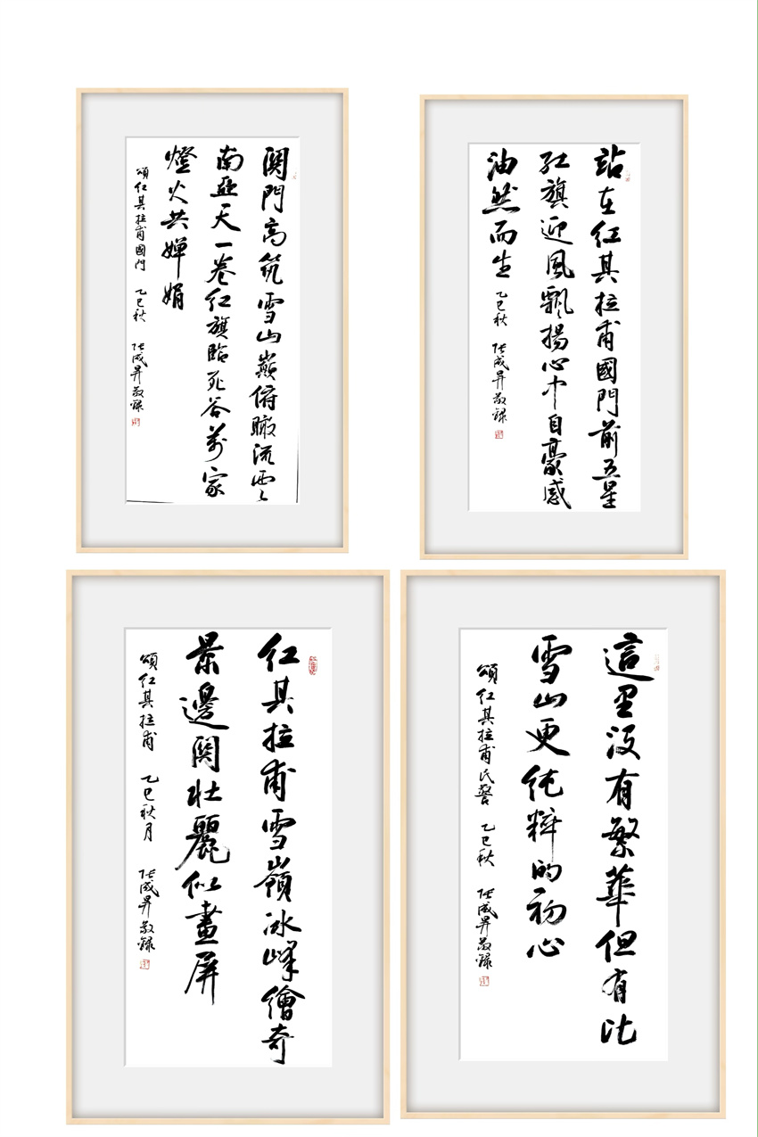 步入展厅,一幅行楷佳作《红其拉甫边检精神赋》气势恢宏,“缺氧不缺精神、艰苦不怕吃苦、海拔高境界更高”的精神口号跃然纸上。笔锋起落之间,仿佛可见边防民警顶风冒雪、巡逻站岗的坚毅身影。移步展区,多幅以红其拉甫精神为主题的作品令人动容:“忆峥嵘岁月初心历久弥坚,恰风华正茂奋斗正当其时”“帕米尔的星空下哨所比月亮更早醒来”“这里没有繁华但有比雪山更纯粹的初心”“关门高筑雪山巅,俯瞰流云南亚天;一卷红旗临死谷,万家灯火共婵娟”……这些作品以笔墨为媒介,字字句句凝结着“守好国门就是守好家”的忠诚与担当。