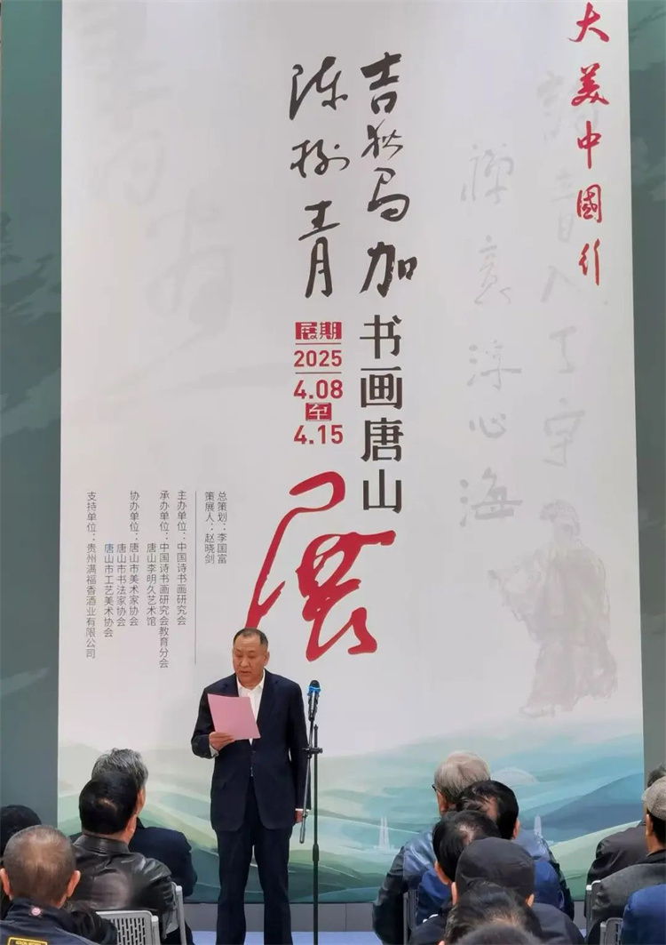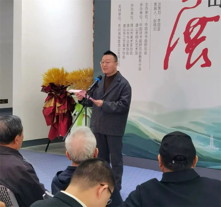 本次展览由中国诗书画研究会教育分会、唐山李明久艺术馆承办,唐山市美术家协会、唐山市书法家协会、唐山市工艺美术协会协办,贵州满福香酒业有限公司支持。唐山学院、唐山师范学院师生代表等百余人出席了开幕式,展览将持续至4月15日。