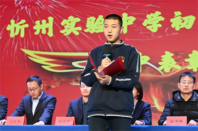 表彰优秀 树立榜样 全体师生肃立注目,齐唱国歌、校歌,表彰大会正式拉开帷幕。获奖的同学们脸上洋溢着自信与喜悦的笑容,这不仅是个人的高光时刻,更是勤奋汗水浇灌出的硕果,为全体同学树立了身边可学、可追、可及的榜样。 ▲获奖学生代表232班王梓超同学寄语全体初三学子