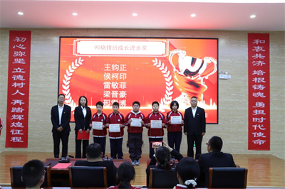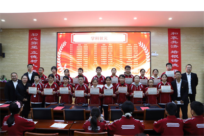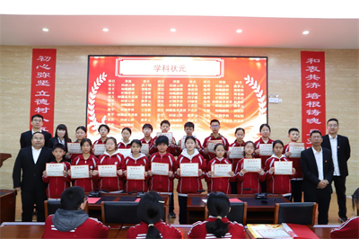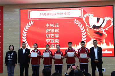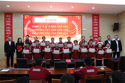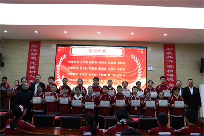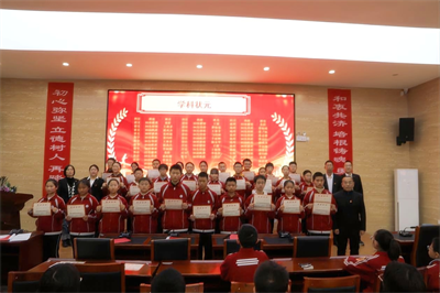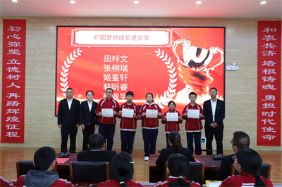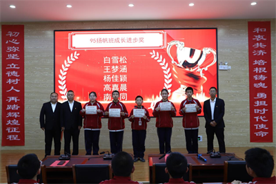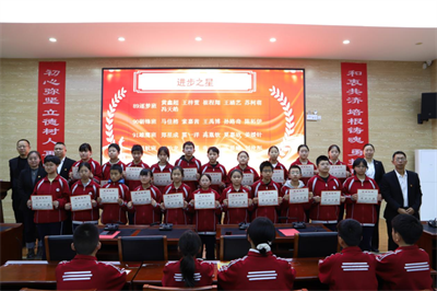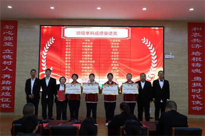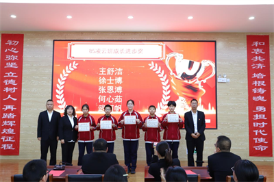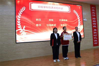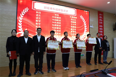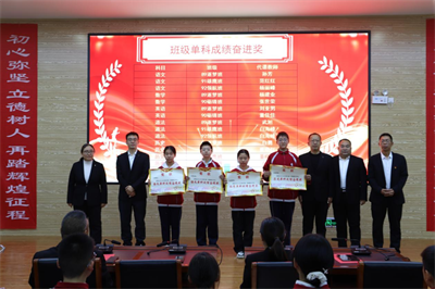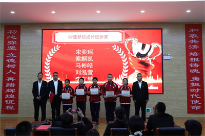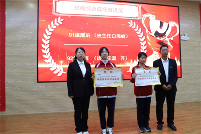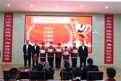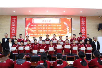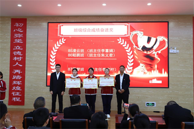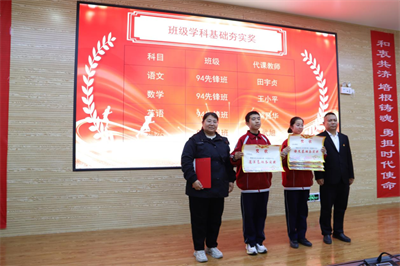 激扬青春 逐梦前行 大会在雄壮的中华人民共和国国歌声中拉开帷幕。随后进行议程第二项“回顾征程,细数成长”。主持人带领全体师生深情回顾了开学以来初一新生入学教育的各项举措与成效:衔接适应扎实推进,行为规范有效落实,综合素质显著提升。大家共同重温了同学们在课堂上的专注、自习时的投入、操场上的奔跑,那一幕幕勤学苦练、挥洒汗水的生动画面。回顾中感受到了同学们在探索中进步、在合作中成长、在挫折中奋起的点滴收获。这些成绩的取得,离不开老师们无私的奉献、家长们默默的守护,也离不开同学们自身不懈的努力。三方合力,共同铺就了成长的阶梯,也成为青春路上最美的印记。 大会现场 郭瑞洋和于镇玮同学主持总结表彰仪式 副校长赵利文老师做总结讲话 榜样为标 拼搏超越 表彰先进,树立榜样是大会的核心环节。在激昂的乐曲和热烈的掌声中,大会依次颁发了“班级综合成绩奋进奖”“班级单科成绩奋进奖”“学科基础夯实奖”“学科优秀率标杆奖”“学习标兵”“进步之星”“单科状元”以及“成长之星”等多个奖项。初一年级班主任及各学科教师先后宣读了饱含激励与肯定的颁奖词,获奖同学依次上台接受表彰,学部中层干部上台为他们颁奖,同学们自信的笑容和昂扬的姿态,充分展现了十二中学子青春阳光、追求卓越的精神风貌。