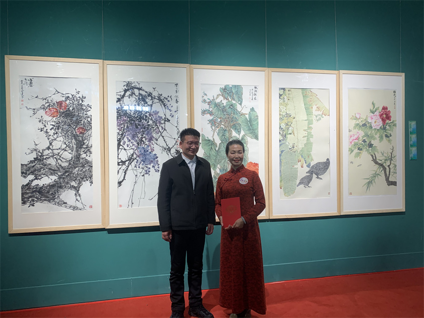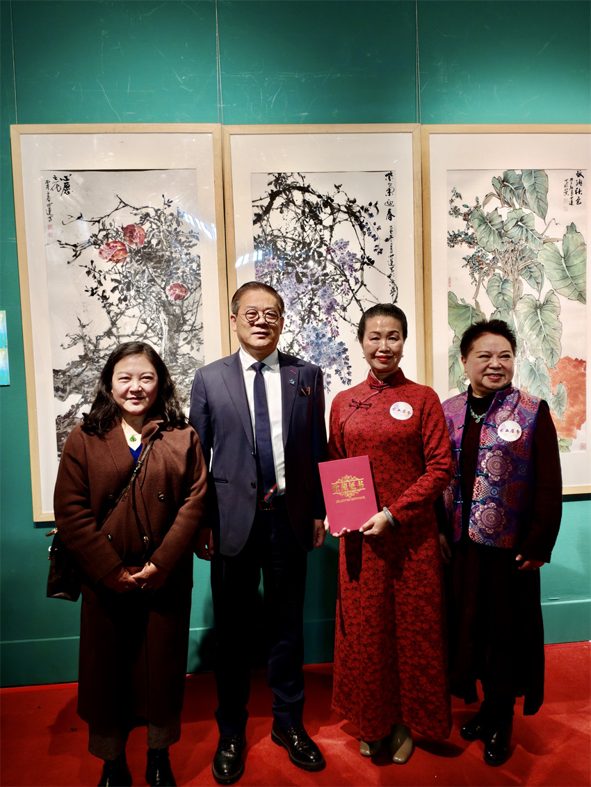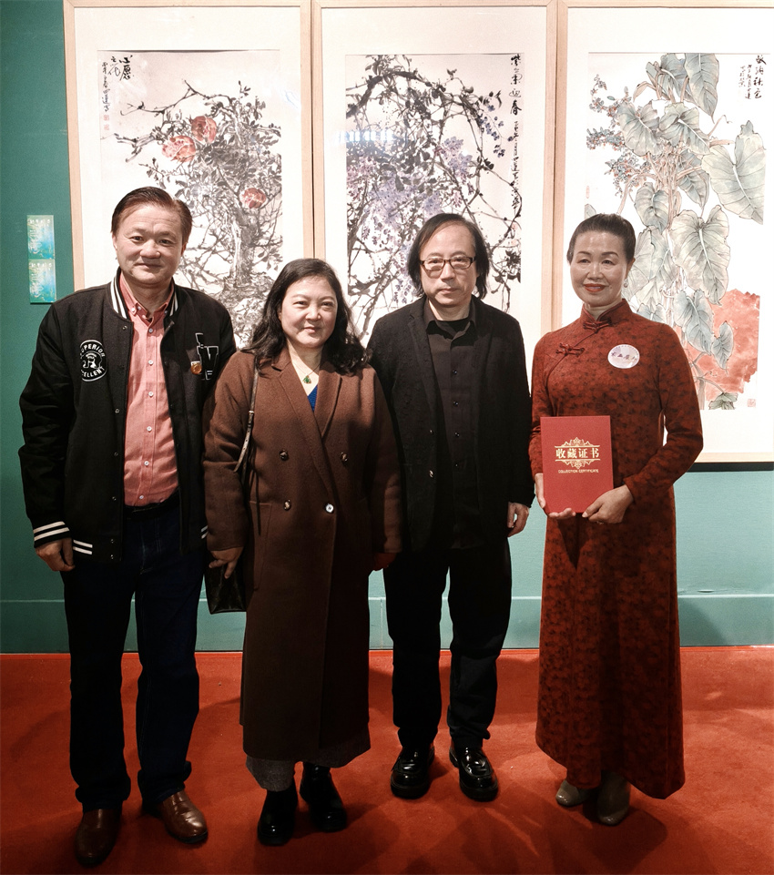 【华夏文化促进会书画分会外联部主任常和书、北京助残爱心公益促进会副会长、华夏文化促进会法治教育与援助委员会副主任、蓝剑书画艺术网副主编段永红、荣宝斋画院名誉院长唐辉、中国美术家协会会员蒋仕莲,在展会上亲切合影】