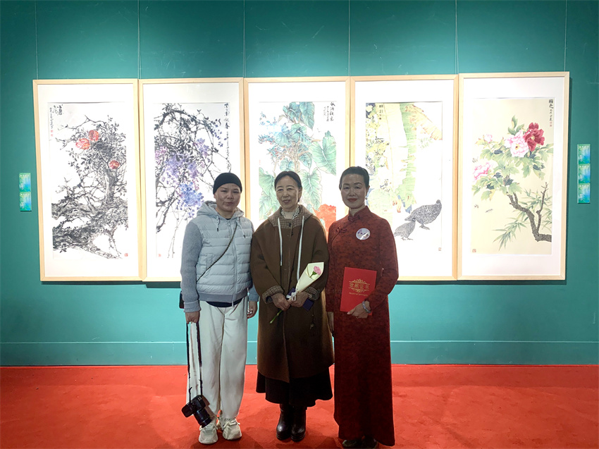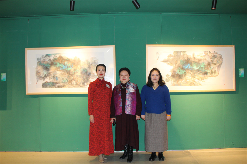【本文作者段永红和云南籍著名女画家耿炎和蒋仕莲在展会上亲切合影】