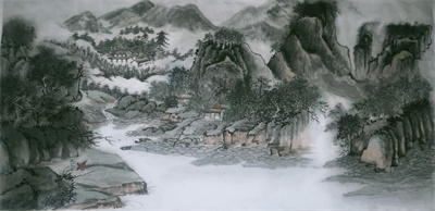 从这个角度来讲,他的山水画不但显成了笔笔见古的法度,也为当代山水画师古求真法指明了道路。不向古人学习,不向旧法取精华,自臆随心造,绝无正宗法!从气质创新的角度来看,他的山水是阳刚美与阴柔美的巧妙合成,阳刚是因为山水得立骨,阴柔是因为山水有气韵。用峰峦凝重的构图,来渡化气势浑雄的伟岸,一幅山水取高远,层层上矗入云霄,上屠浮云,下览深谷,乾坤在画里,当然是阳刚。