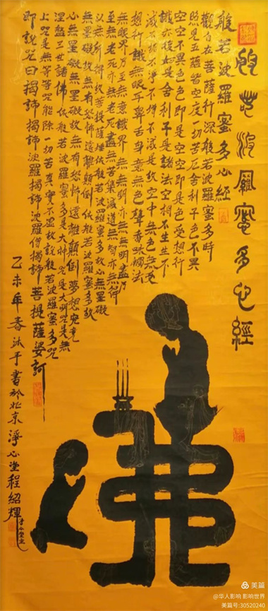 程绍辉 先生净心堂堂主影响力人物著名禅意书法大师 籍贯河南,现住北京,自幼酷爱书法,根植于中原沃土,结善缘 、习禅宗、重仁爱、修正德、结佛缘。主攻禅意书法,对国粹艺术情有独钟。凭着他智聪的慧性,刻苦认真地钻研,坚持不懈的努力:历经数载磨砺,书法艺术风格独树一帜,颇具影响,其禅意书法作品,被众多国家博物馆及佛教寺院、世界各国名流人士和收藏家珍藏。中国书画艺术传承人程绍辉,走近程大师,其人其艺,堪称俊才与绝妙,谈吐文雅,不但流露出他对书画艺术的痴情挚爱,而且彰显出他的谦恭有礼的善举,更洋溢着艺术家蓬勃向上正能量的风范。现任:东方文化书画院院长,新时代党建 杂志社 顾问联合国书画家协会中国分会副主席,国际书法家艺术研究院名誉院长,东方文化报社副社长,香港环亚卫视副台长,中国文化产业报名誉社长,中国梦杂志社副社长,中国少林杂志社副社长。香港少林禅拳书画院副院长。现有今日头条、中国少林杂志社、凤凰 卫视中国梦杂志社、香港环亚卫视、中央电视台《世纪大采风》、中央电视台《影响力人物》、中央电视台《老故事频道》特邀贵宾等众多媒体专访报导。他书写的“佛”字入选为庆祝中国共产党第十八次全国代表大会出版的《继往开来》名家书画作品集等。