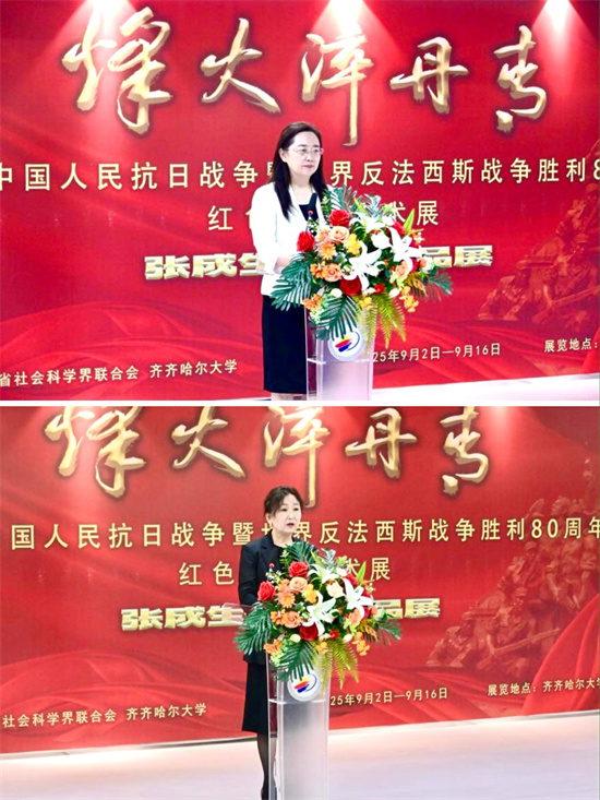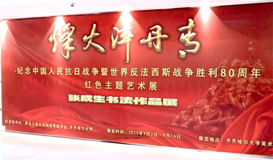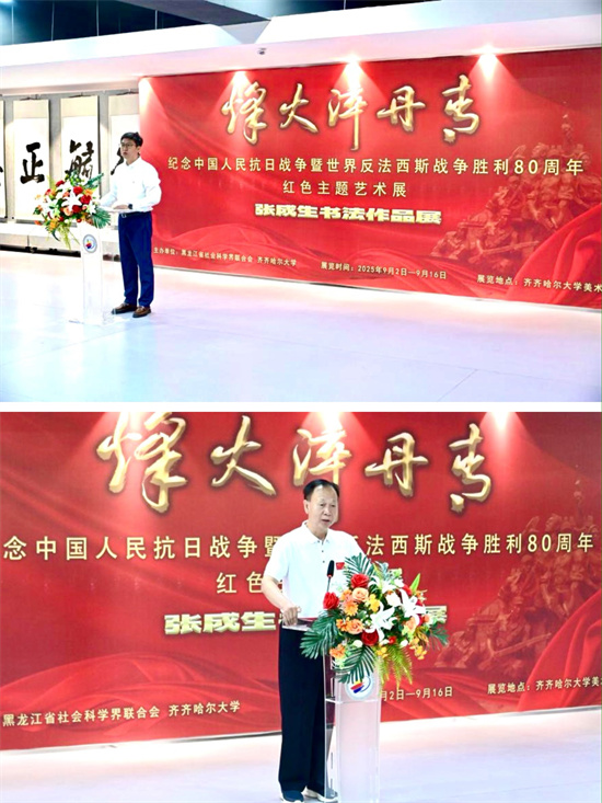 为纪念中国人民抗日战争暨世界反法西斯战争胜利80周年,9月2日,“烽火淬丹青——张成生书法作品展”在齐齐哈尔大学开幕。红色书法家张成生,中泰证券股份有限公司北京综合金融中心总经理张志,齐齐哈尔市文联党组成员、副主席李亚春,校领导丁宏、齐宏伟、张文治,校党委常委、宣传部部长杜海权出席开幕式,校美术与艺术设计学院院长孟德鸿主持,校党委副书记、工会主席齐宏伟宣布展览开幕。