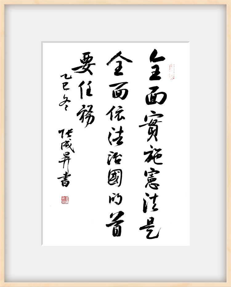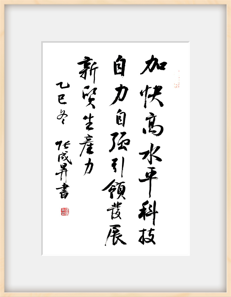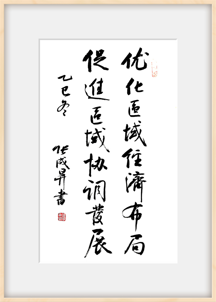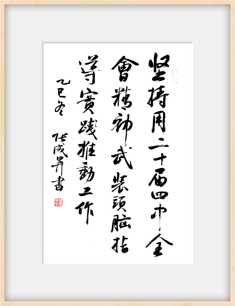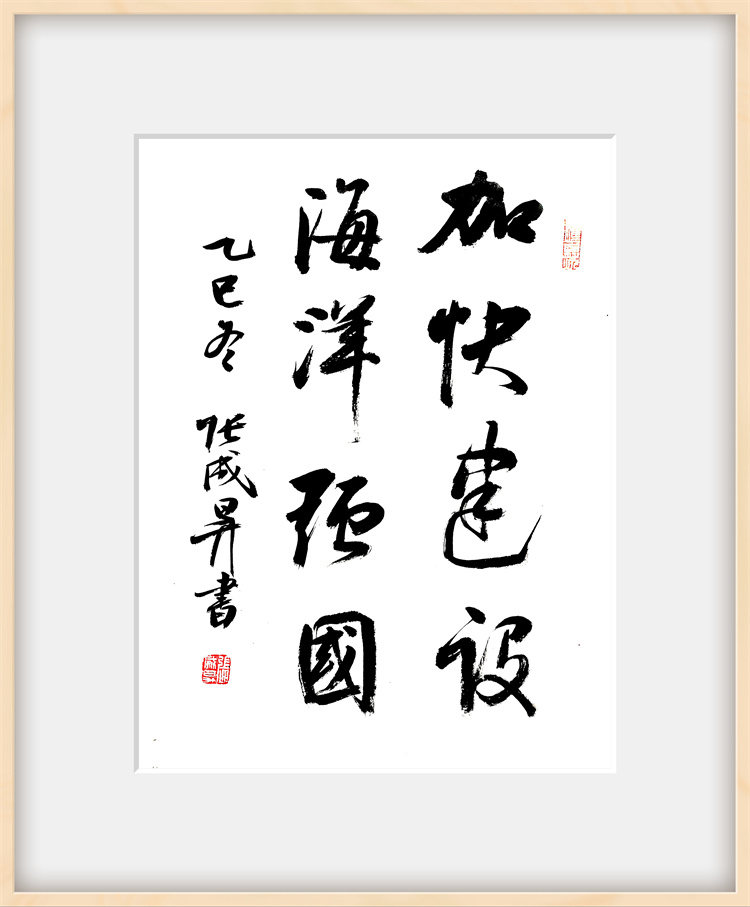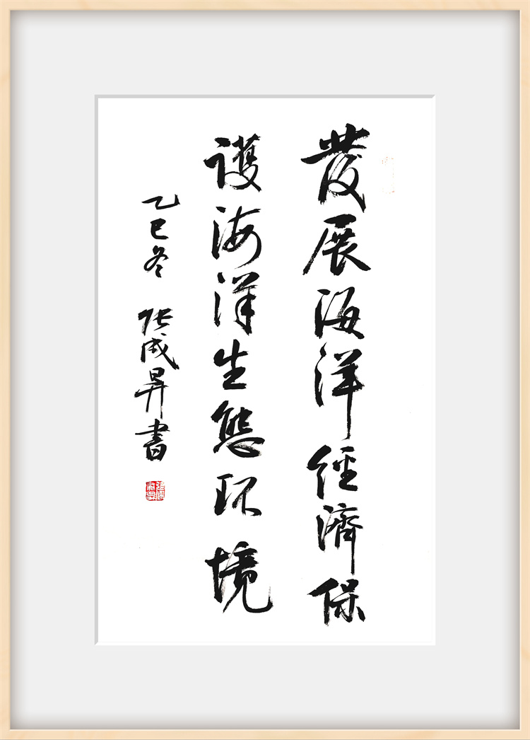 展览聚焦 “党的二十届四中全会精神与海洋经济” 核心主题,作者张成生倾情创作了系列书法作品。所有作品内容均精选自党的二十届四中全会精神核心要义与金句,笔力遒劲,气势恢宏。观众既能欣赏到“坚持高质量发展是新时代的硬道理”、“全面推进国家治理体系和治理能力现代化”等重大论断的翰墨呈现,也能感受到“加快建设海洋强国”、“发展海洋经济,保护海洋生态环境”等关乎海洋战略部署的笔墨抒发。一幅幅作品如同时代号角,将党的创新理论、宏伟蓝图转化为极具视觉冲击力和艺术感染力的文化载体,在点画纵横间传递出坚定的政治信念和昂扬的奋斗精神。
